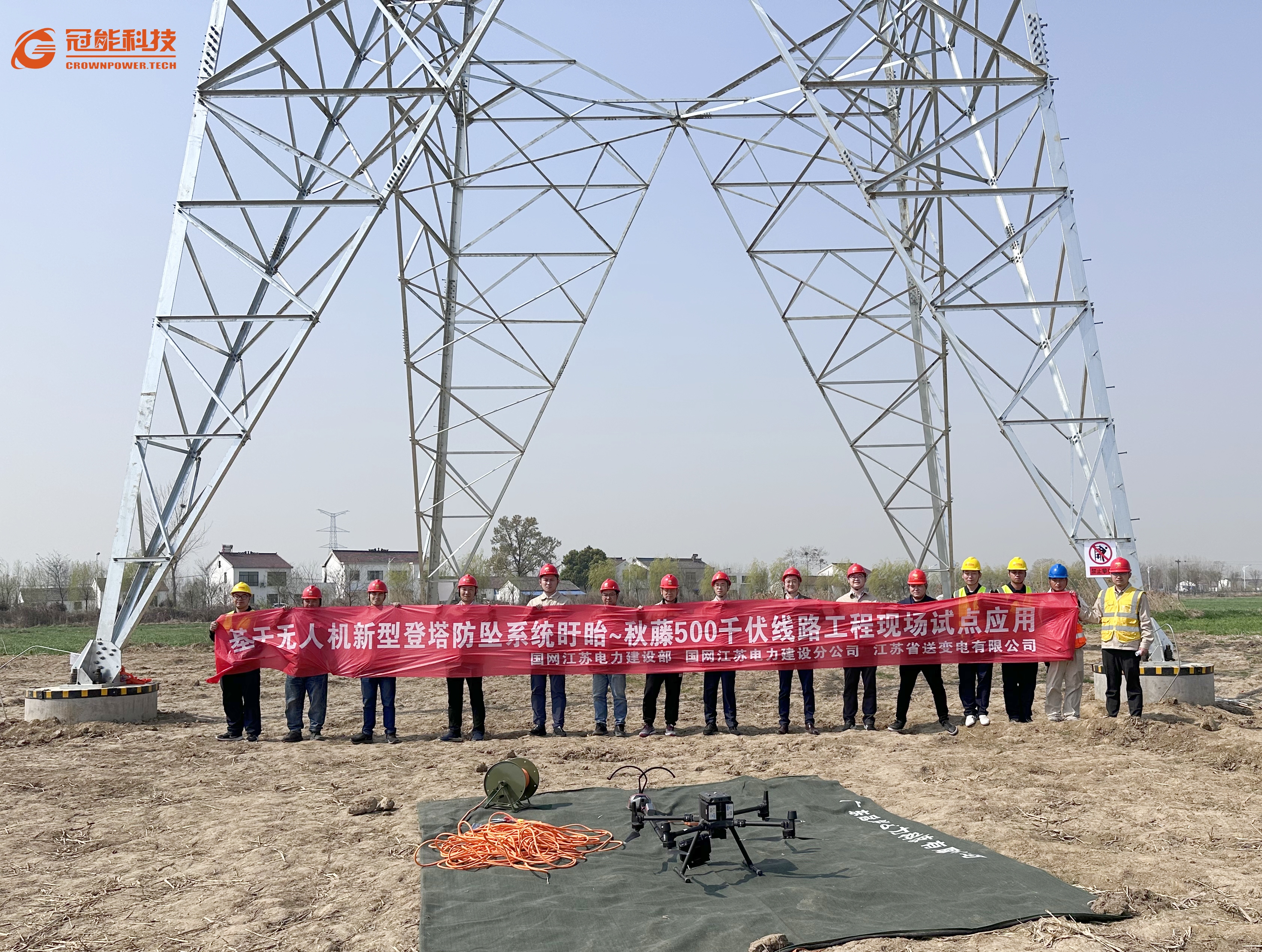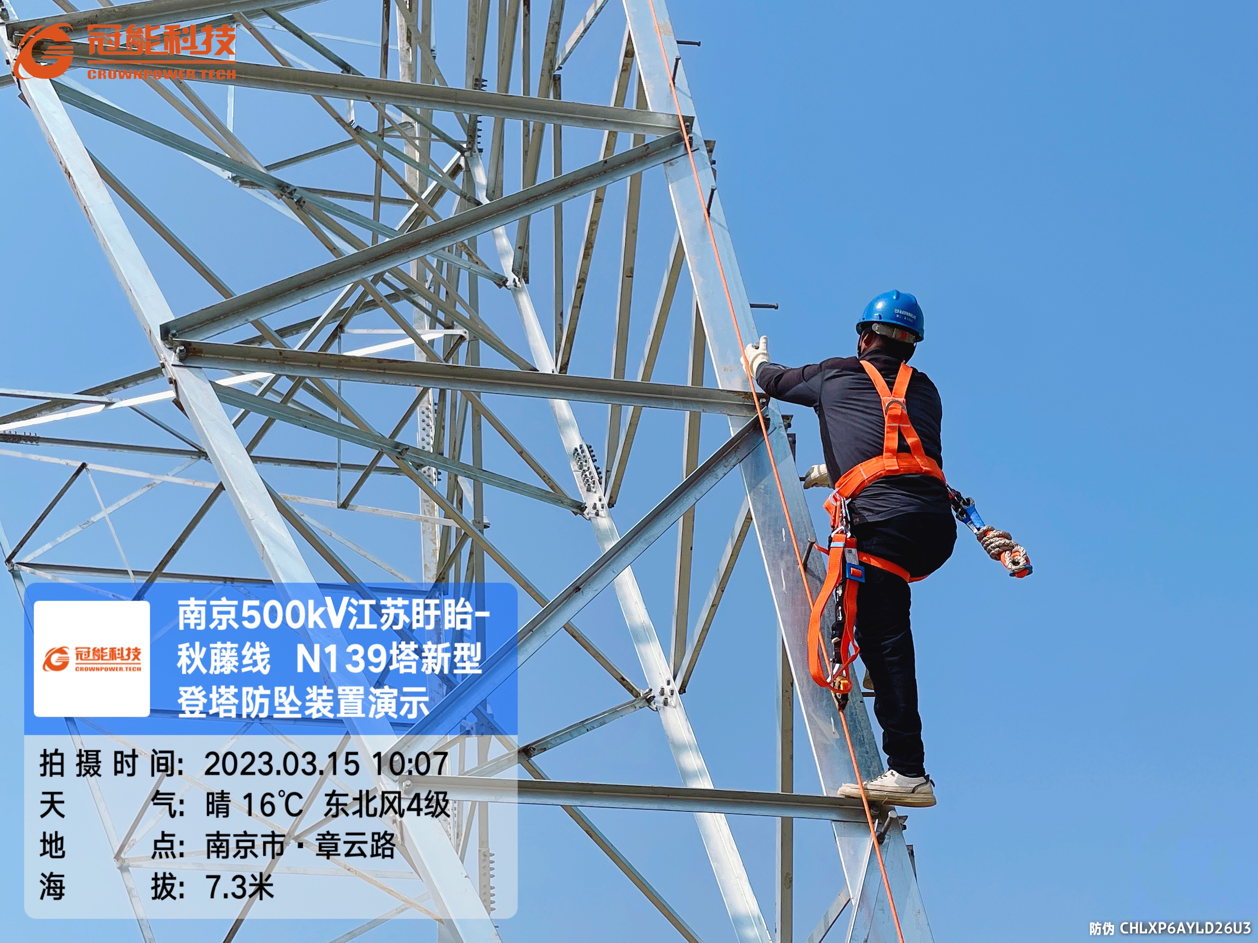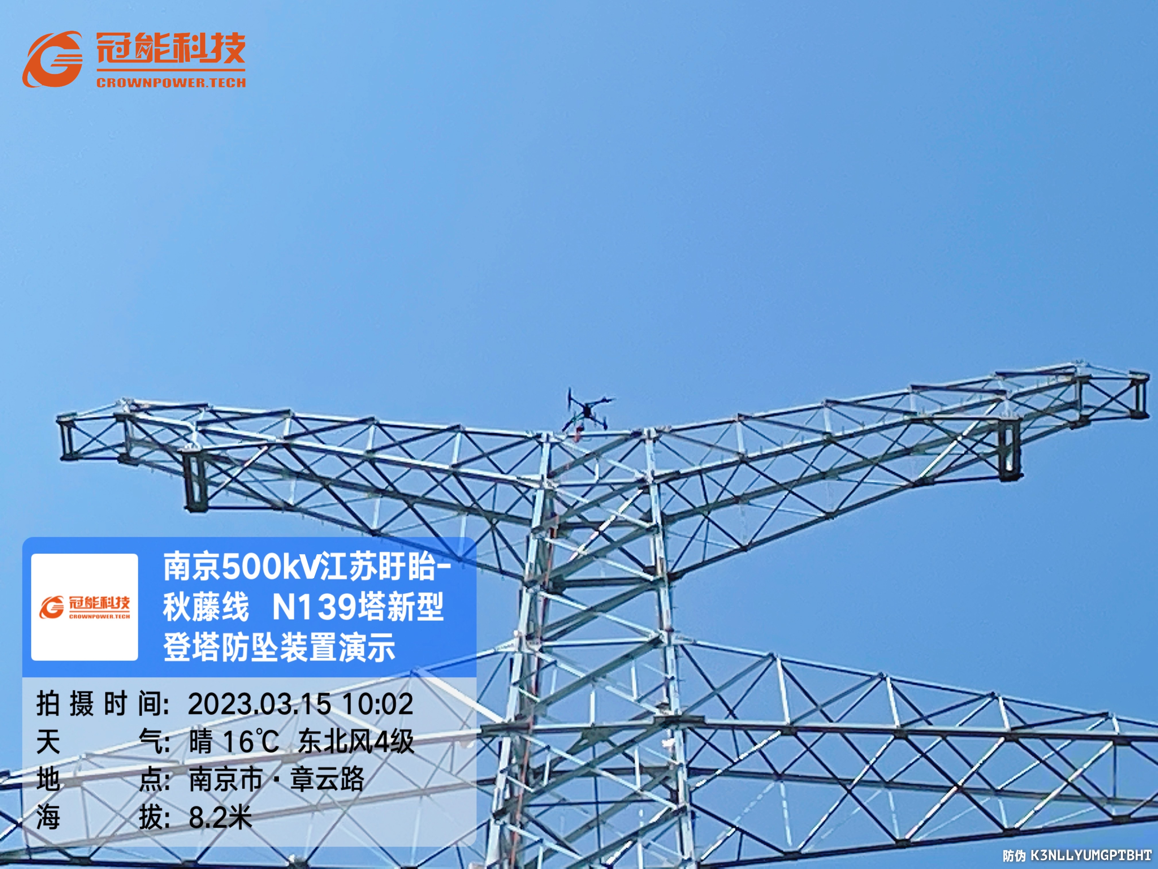 3月15號,冠能科技公司受邀國網江蘇電力工程咨詢公司在盱眙~秋藤500千伏線路工程現場進行新型登塔防墜落裝置試點應用。